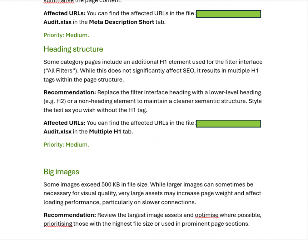 Prioritised Recommendations and Report Delivery — Your report explains the issues, their likely effect on visibility, and the recommended actions in an order that makes progress easier. This helps teams focus on what matters instead of trying to fix everything at once.